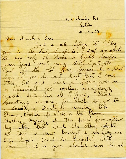 Just a note hoping it Catches your’s in the best of spirits. I don’t know what to say only the house is terrible lonely since you’s went away. Well I got the Push off the old firm, because he couldn’t pay us so he went bust, But I come thru OK and click a better job on a Vauxhall job working seven days a week. Well hears all I know. “Flash” Courtneys looking for “Tails” to go to a Social, Bridgets dancing like Elenar Powell up & down the floor.