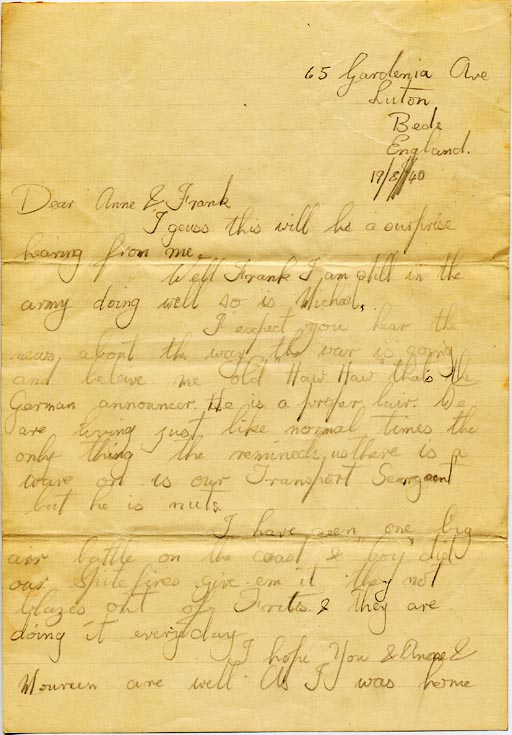 I expect you hear the news about the way the war is going and believe me old Haw Haw that’s the German announcer. He is a proper lair. We are living just like normal times the only thing the reminds us there is a war on is our Transport Sergeant but he is nuts.