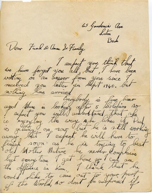 I expect you think that we have forgot you all, but, I have been waiting on an answer from you since I received your letter in Sept 1940, but nothing has arrived