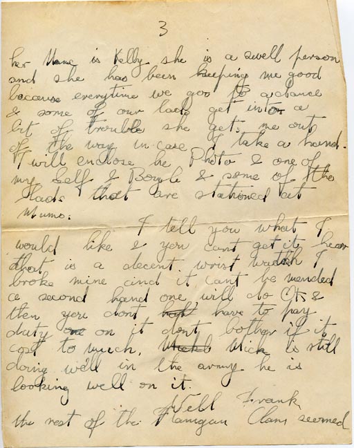 her name is Kelly she is a swell person and she has been keeping me good because every time we go to a dance & some of our lads get into a bit of trouble she gets me out of the way in case I take a hand. I will enclose the Photo & one of myself & Boyle & some of the lads that are stationed at Mums.
