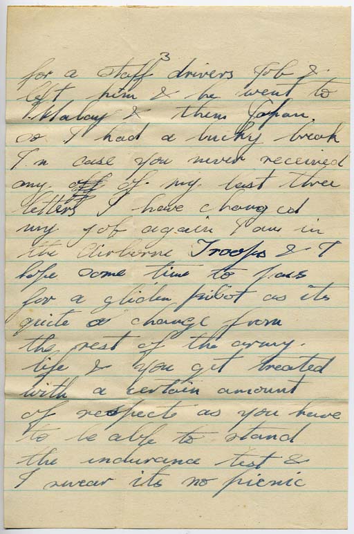 In case you never received any of my last three letters I have changed my job again & am in the Airborne Troops & I hope some time to pass for a glider pilot as its quite a change from the rest of the army life & you get treated with a certain amount of respect as you have to be able to stand the endurance test & I swear its no picnic