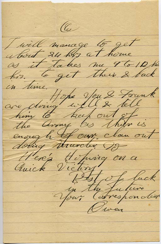Hope You & Frank are doing well & tell him to keep out of the Army as there is enough of our own clan out doing murder.